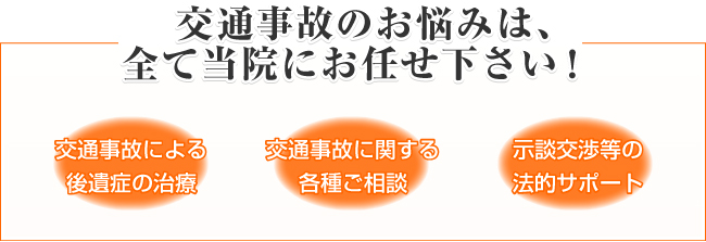 当院は、交通事故後遺症の治療はもちろんのこと交通事故にまつわるご相談にも的確に対応する事ができる交通事故治療専門院です。