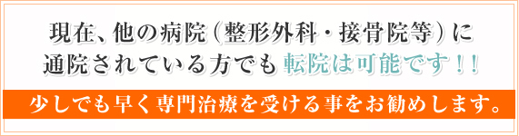 現在、他の病院(整形外科・接骨院等)に通院されている方でも転院は可能ですので、少しでも早く交通事故専門院での的確な治療を受けられることをおすすめいたします。